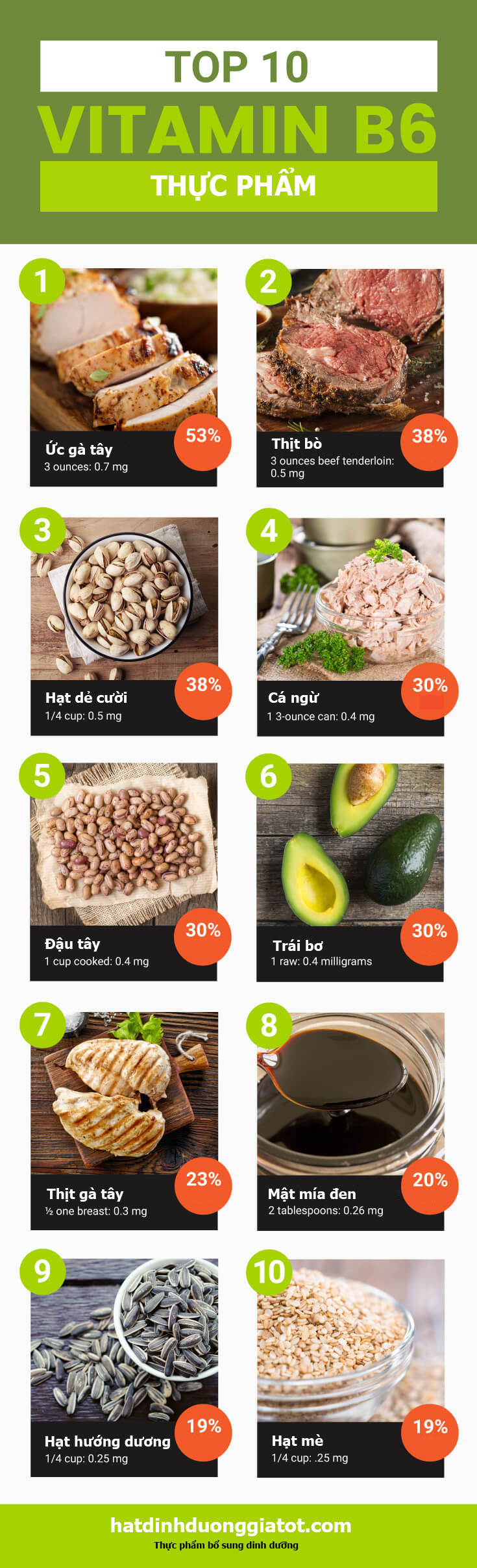 10 loại thực phẩm giàu vitamin B6 gồm có thịt gà tây, thịt bò, hạt dẻ cười, cá ngừ, đậu, bơ, ức gà, mật mía, hạt hướng dương và hạt mè.