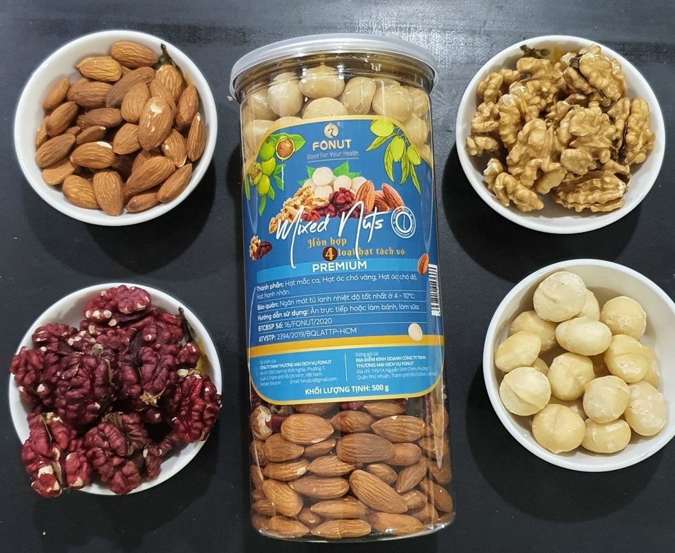 Hạt dinh dưỡng Mixed Nuts 4 loại hạt : hạt hạnh nhân, hạt macca, hạt óc chó vàng, hạt óc chó đỏ được nhập khẩu chính ngạnh từ nguồn nguyên liệu sạch tại các nước.